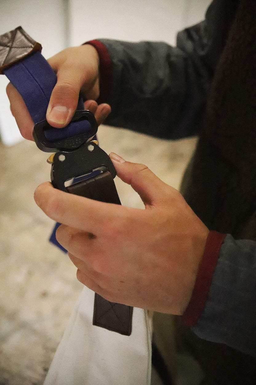 カジュアルなアイテムをベースにして、彫刻のような感覚で左右非対称にくり抜いたシルエットに変形し、存在感のあるCOBRAバックルを採用しました。