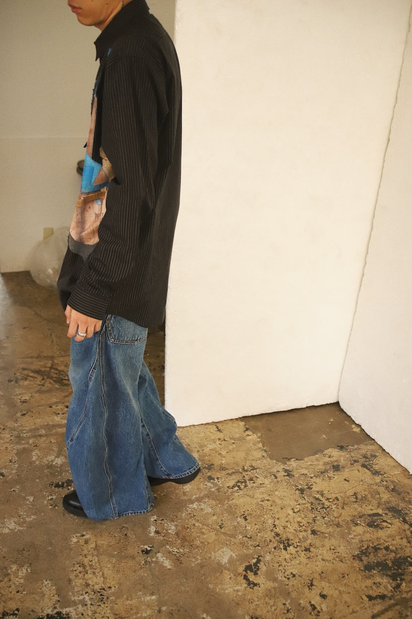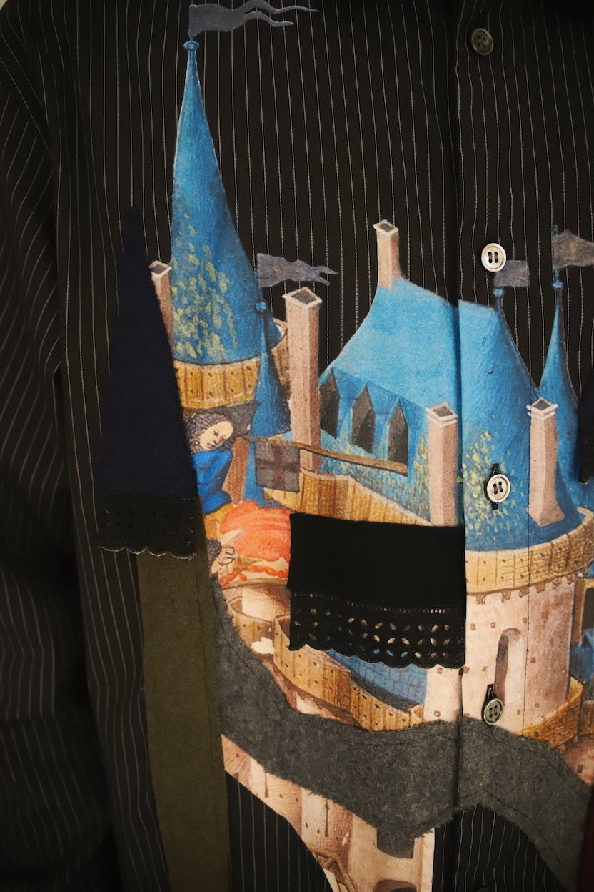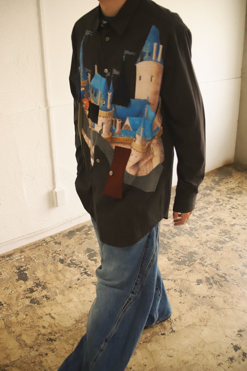 お城のプリントとパッチワークを組み合わせ、トロンプルイユ的な楽しさを持つシャツにしました。