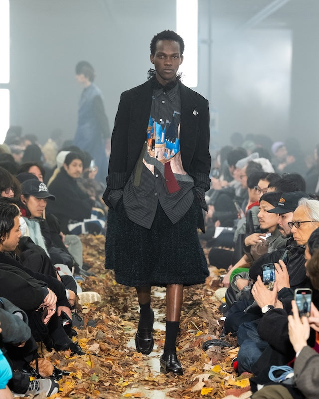 今季のキーワードのひとつである、メンズ服の文脈におけるレースの活用を投影した、ストライプ柄の長袖シャツ。