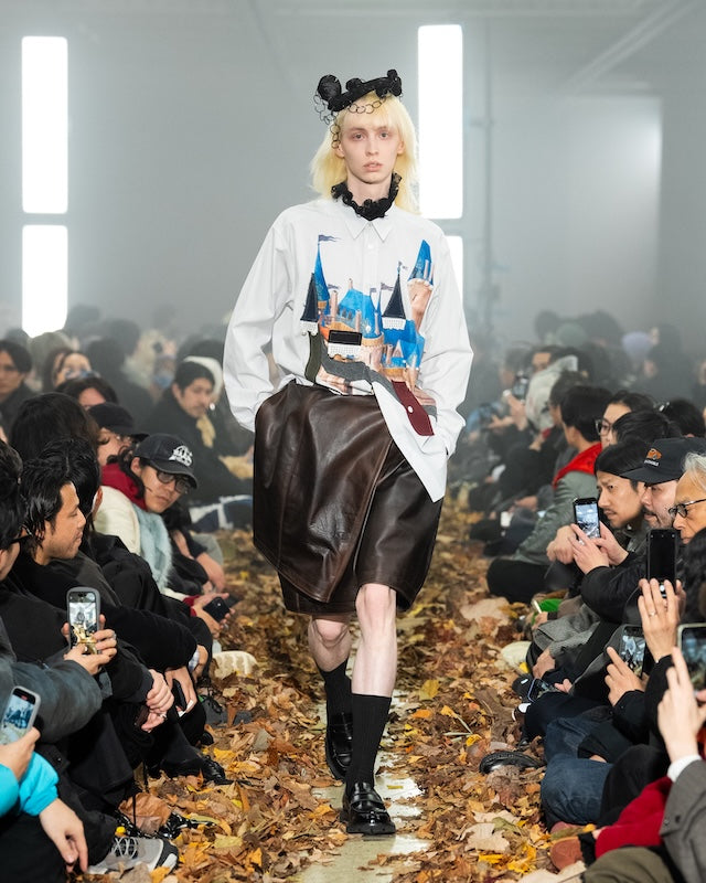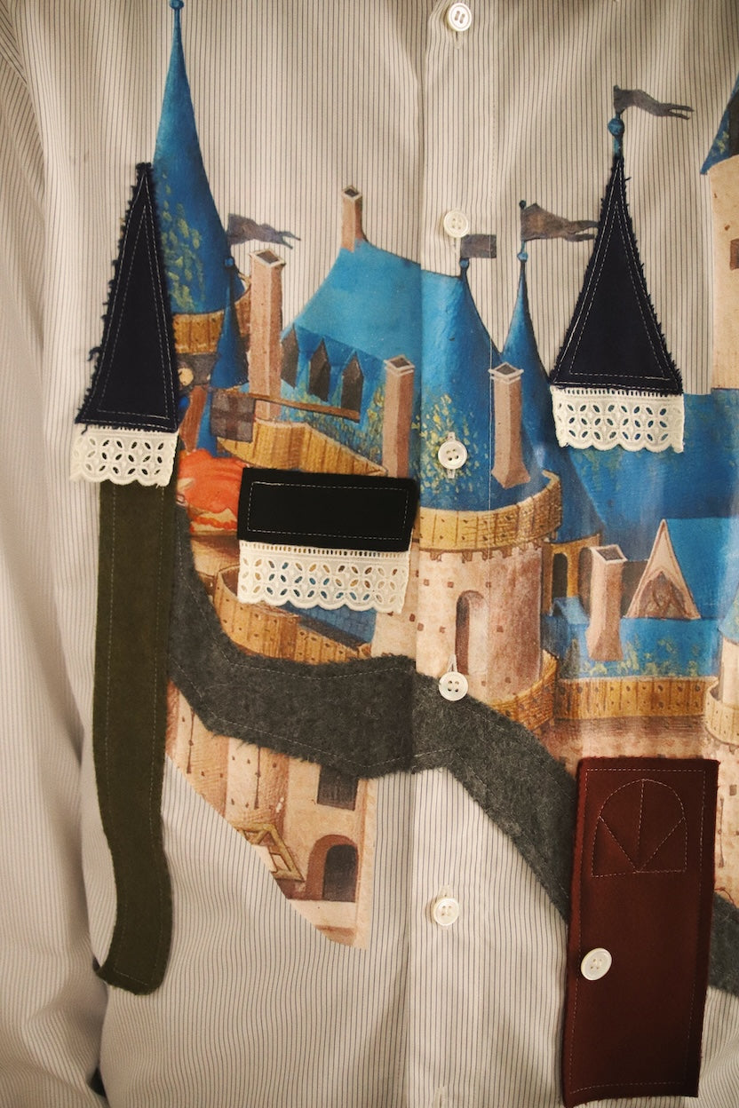 お城のプリントとパッチワークを組み合わせ、トロンプルイユ的な楽しさを持つシャツにしました。