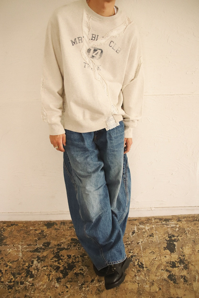 カレッジプリントを施した裏毛生地が崩れて、中のレースが現れるような表現になっています。