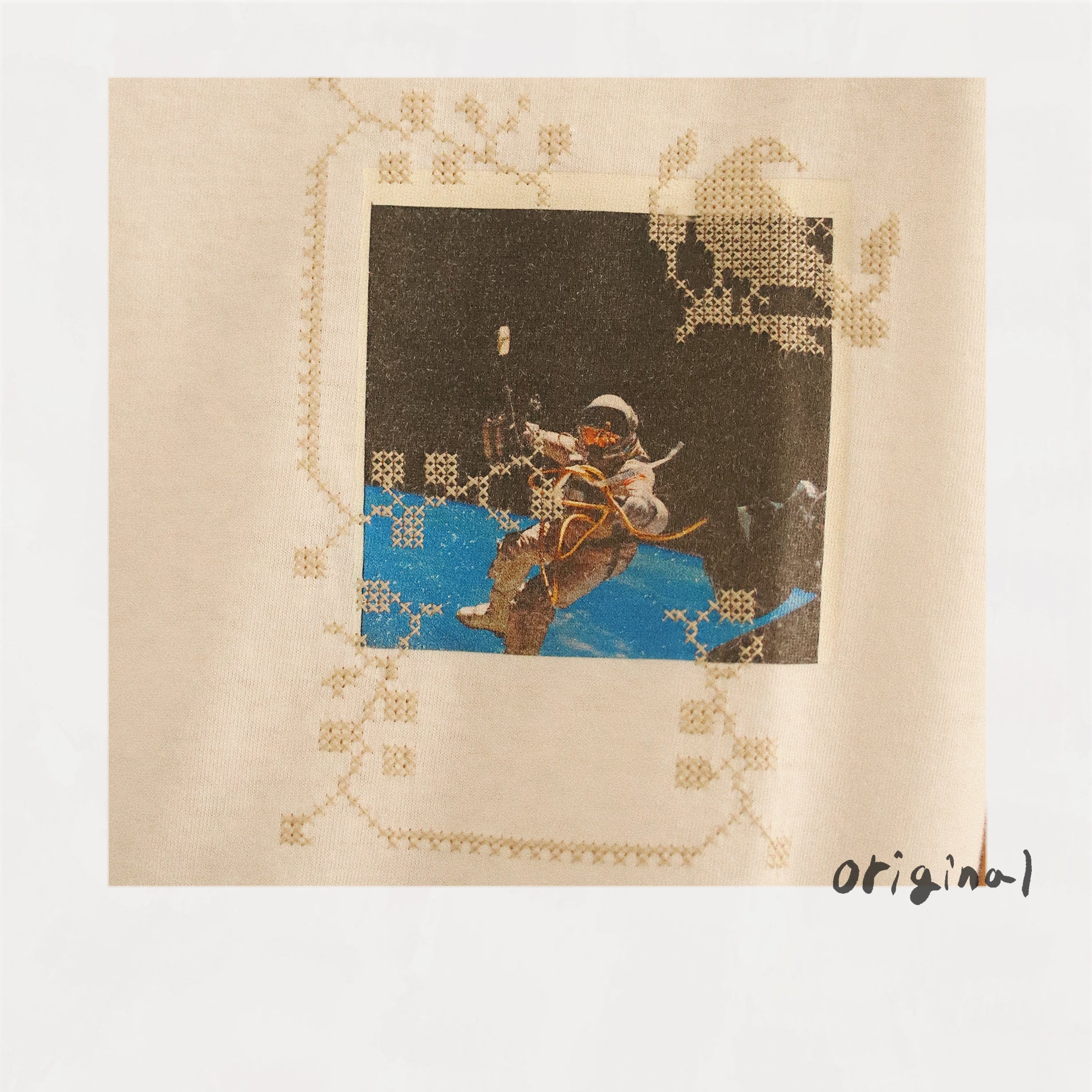 宇宙飛行士の写真を部屋中に飾っていた幼少期の思い出を着られるように、洋服として表現。