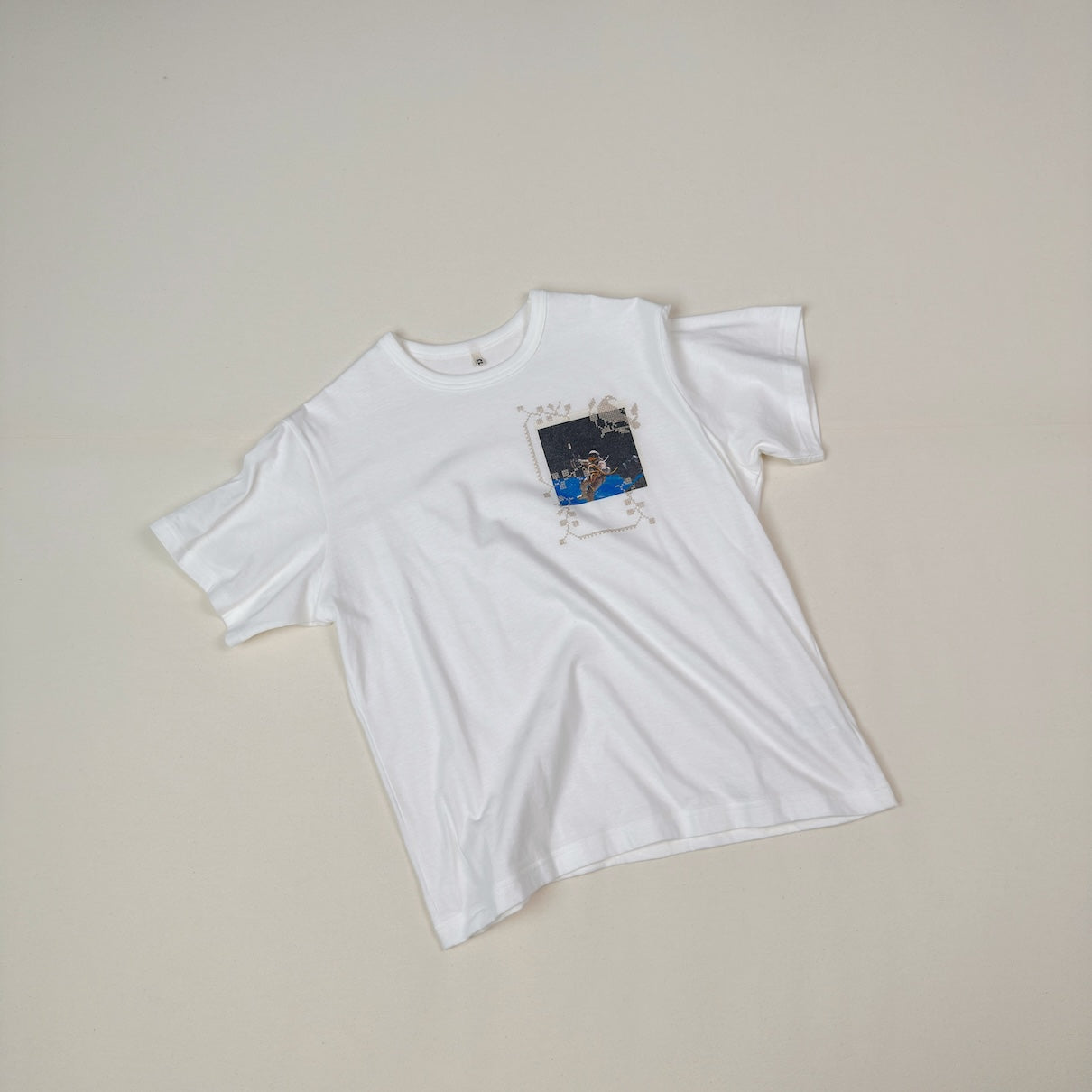 宇宙飛行士のプリントと刺繍を施した、半袖Tシャツ。