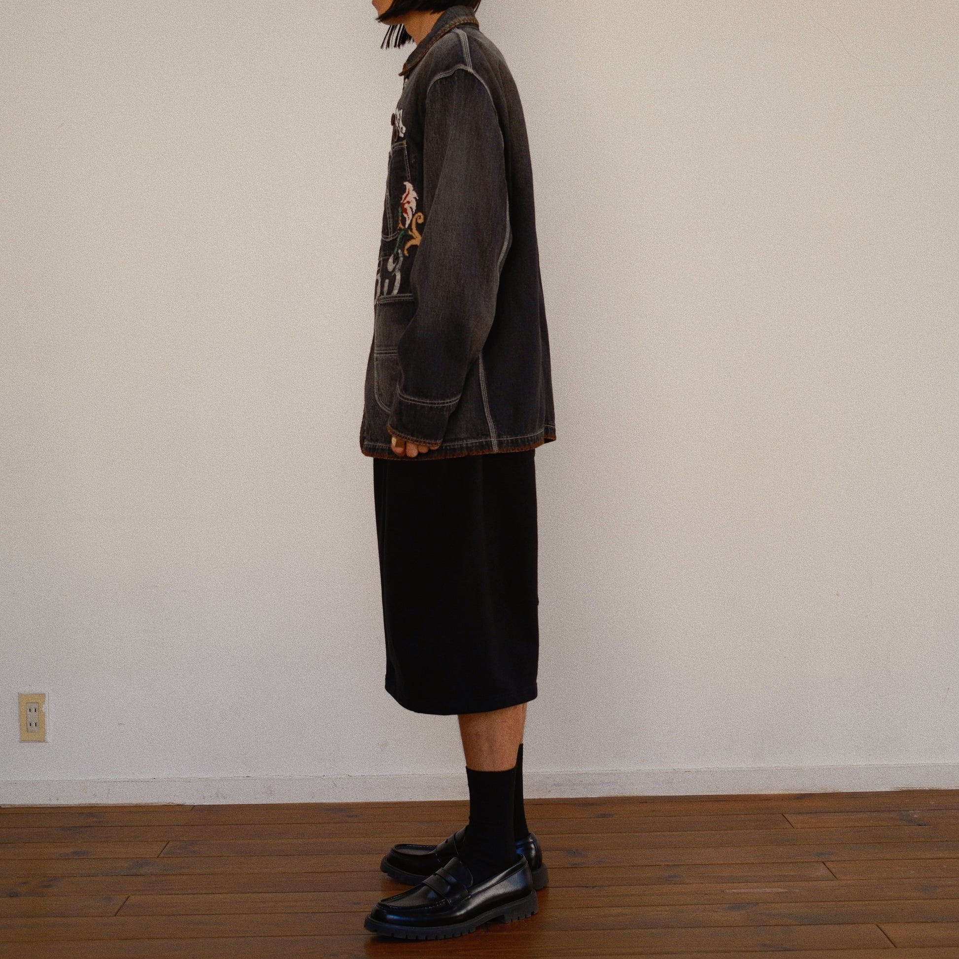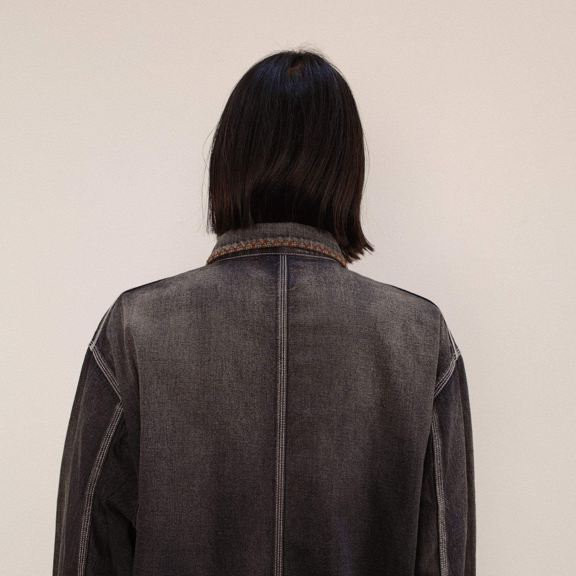 KHOKI の象徴的な手刺繍が施されたデニムのカバーオールコート。