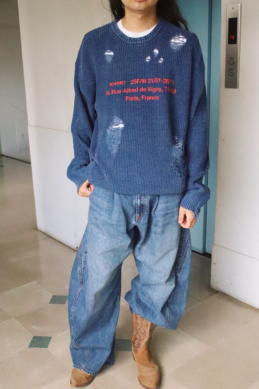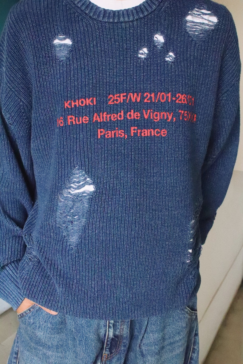 インディゴ染料で染めたコットン糸で仕立てた、ダメージプルオーバーニット。