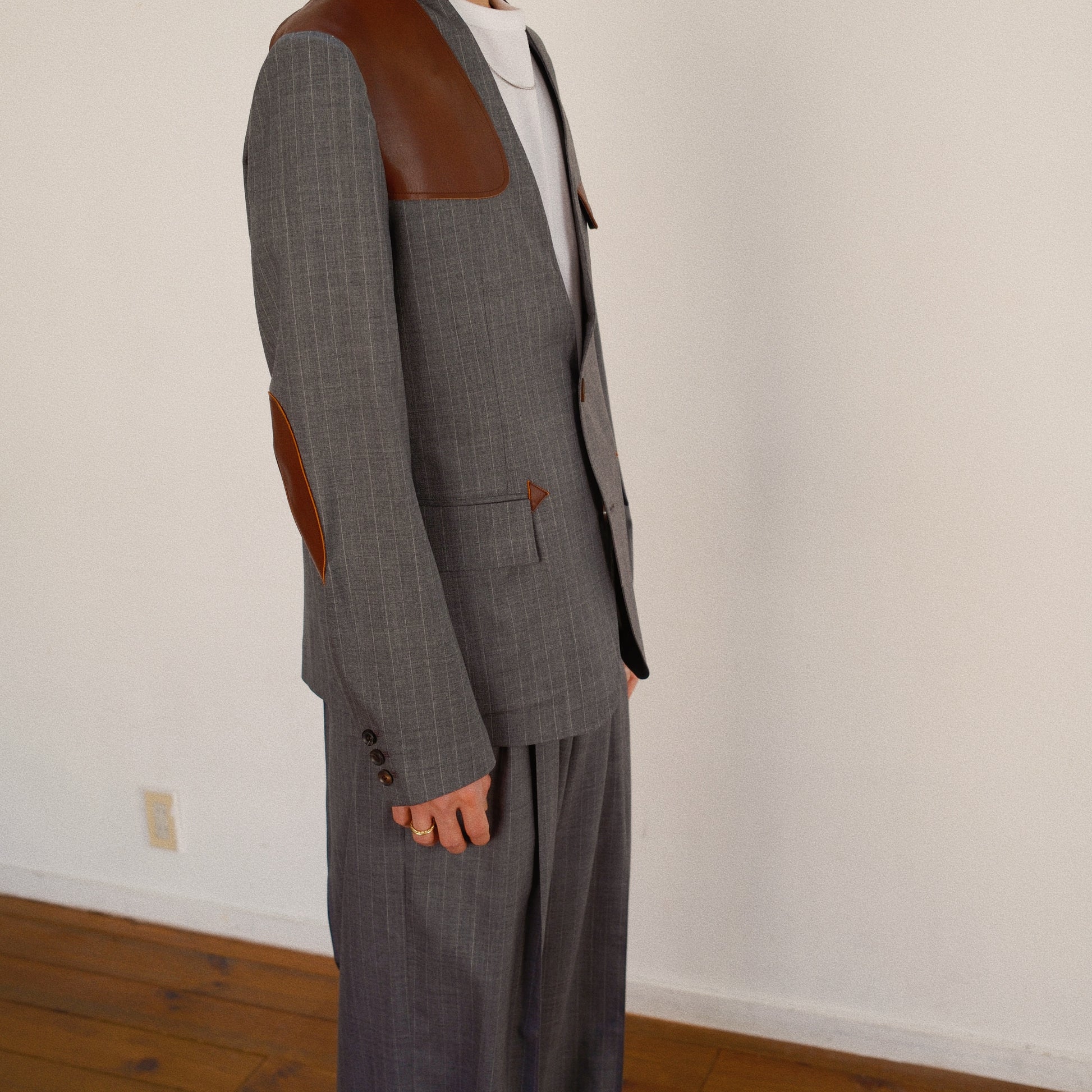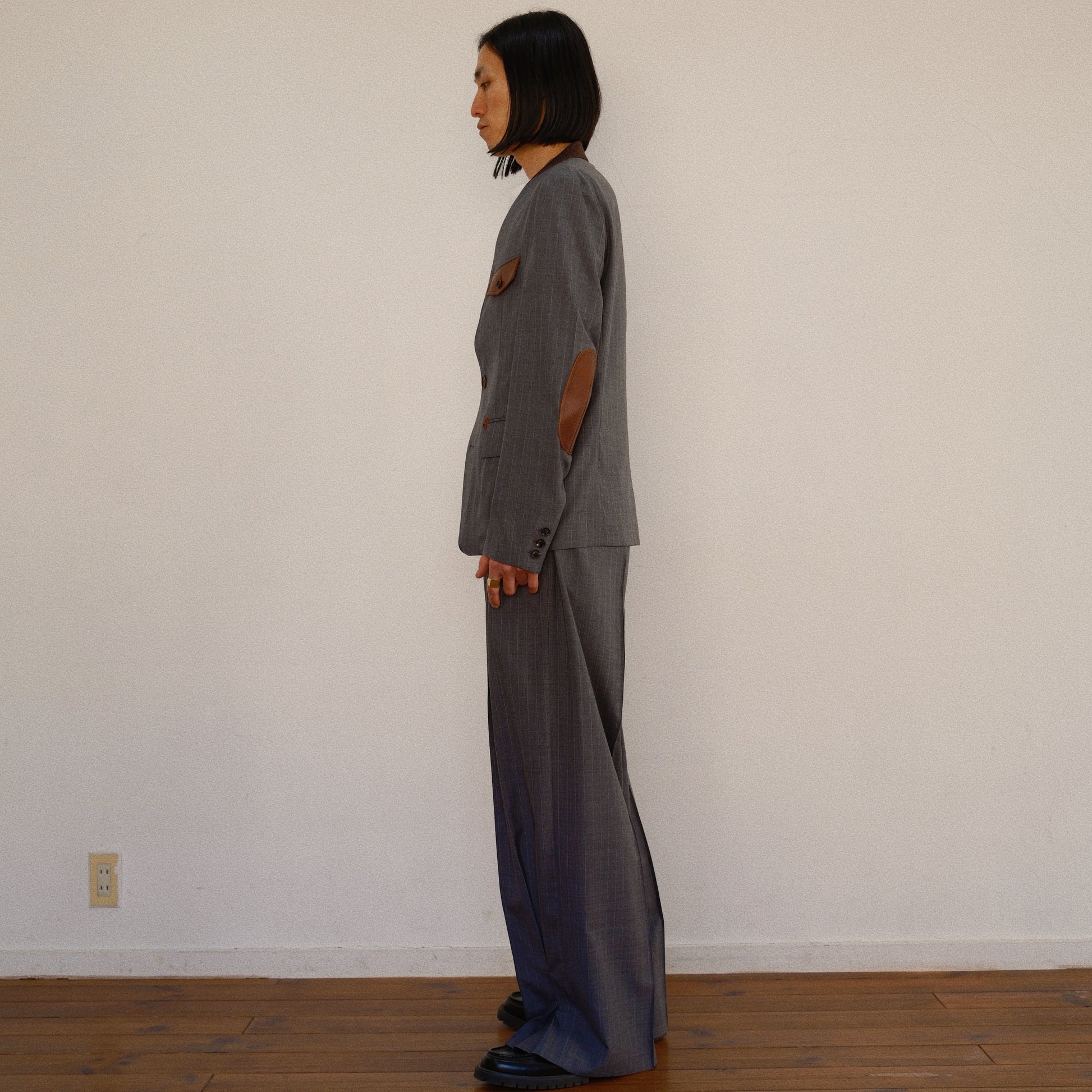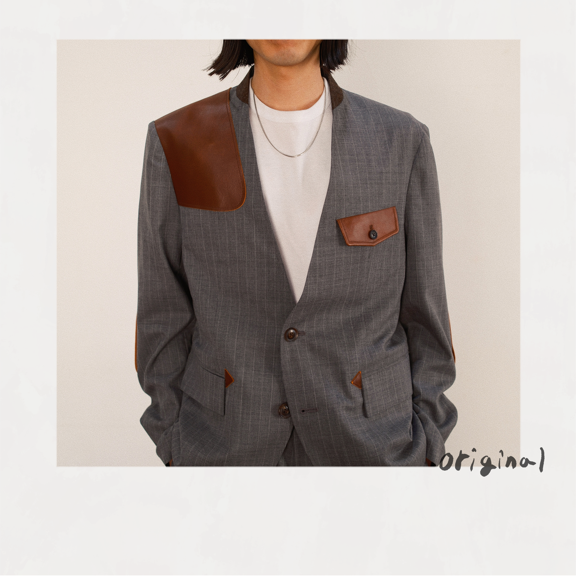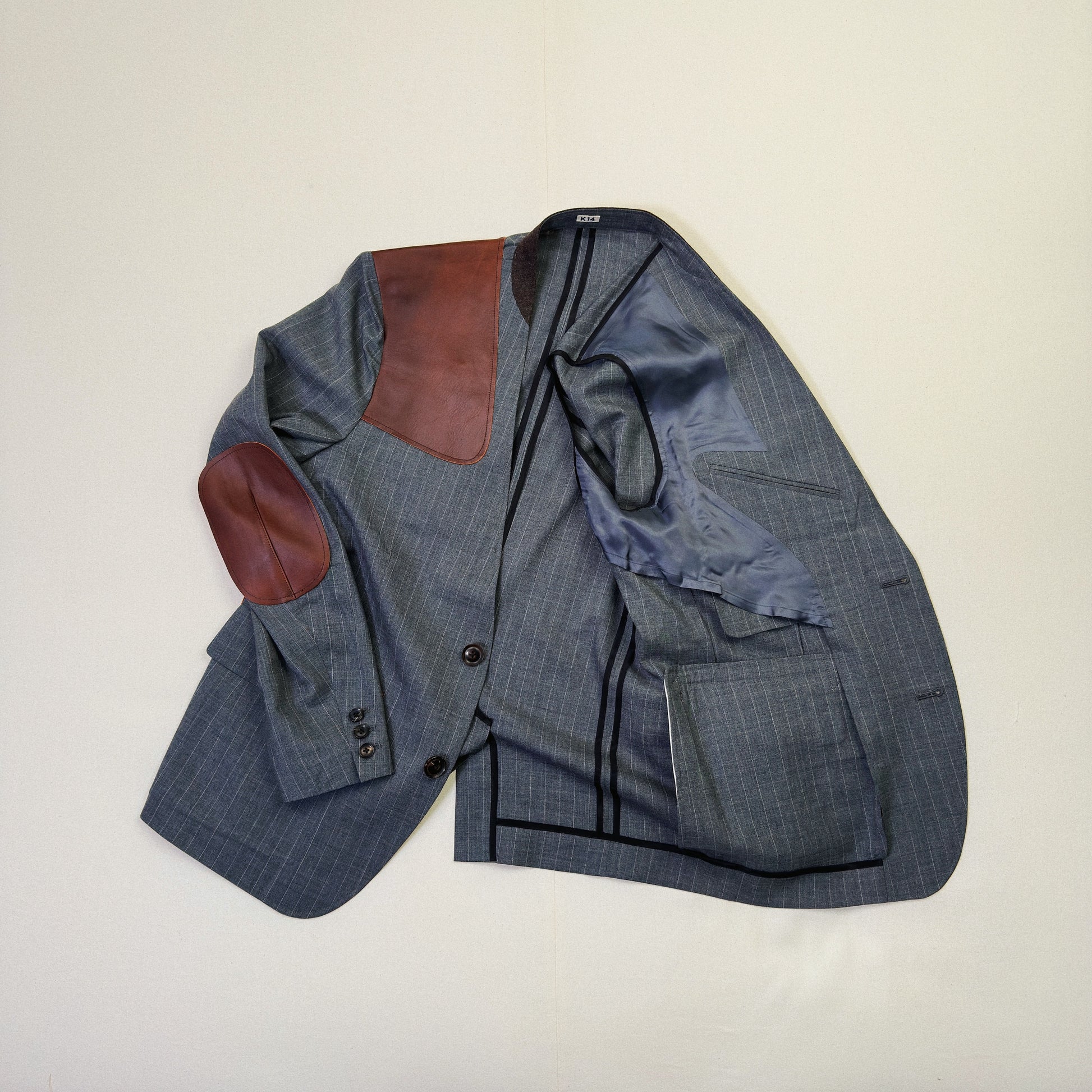 1枚仕立てのテーラードへ、ハンティングジャケットの要素を組み込んだサマーウール素材の商品です。
