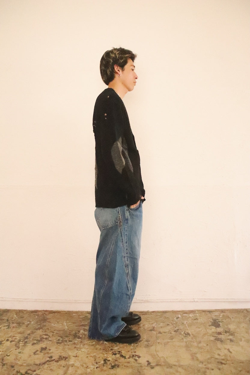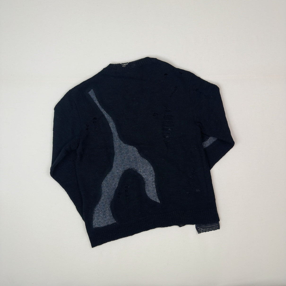 今季のキーワードのひとつである、メンズ服の文脈におけるレースの活用を投影した、ニットカーディガン。