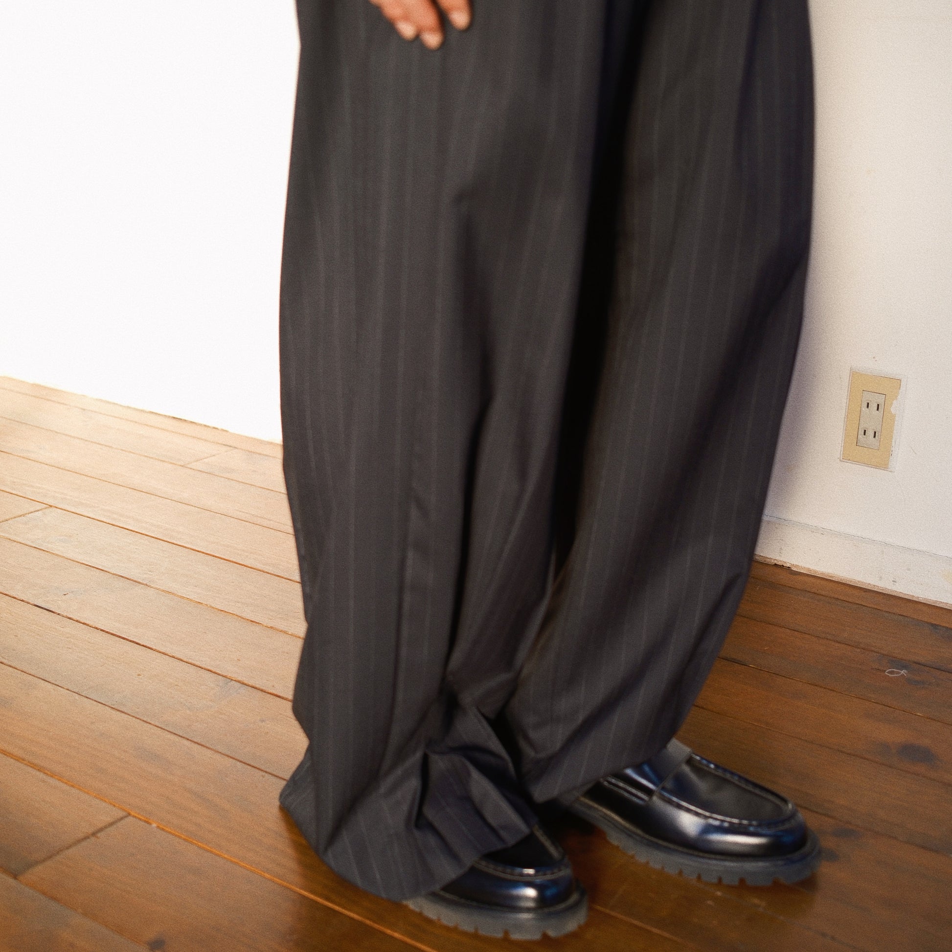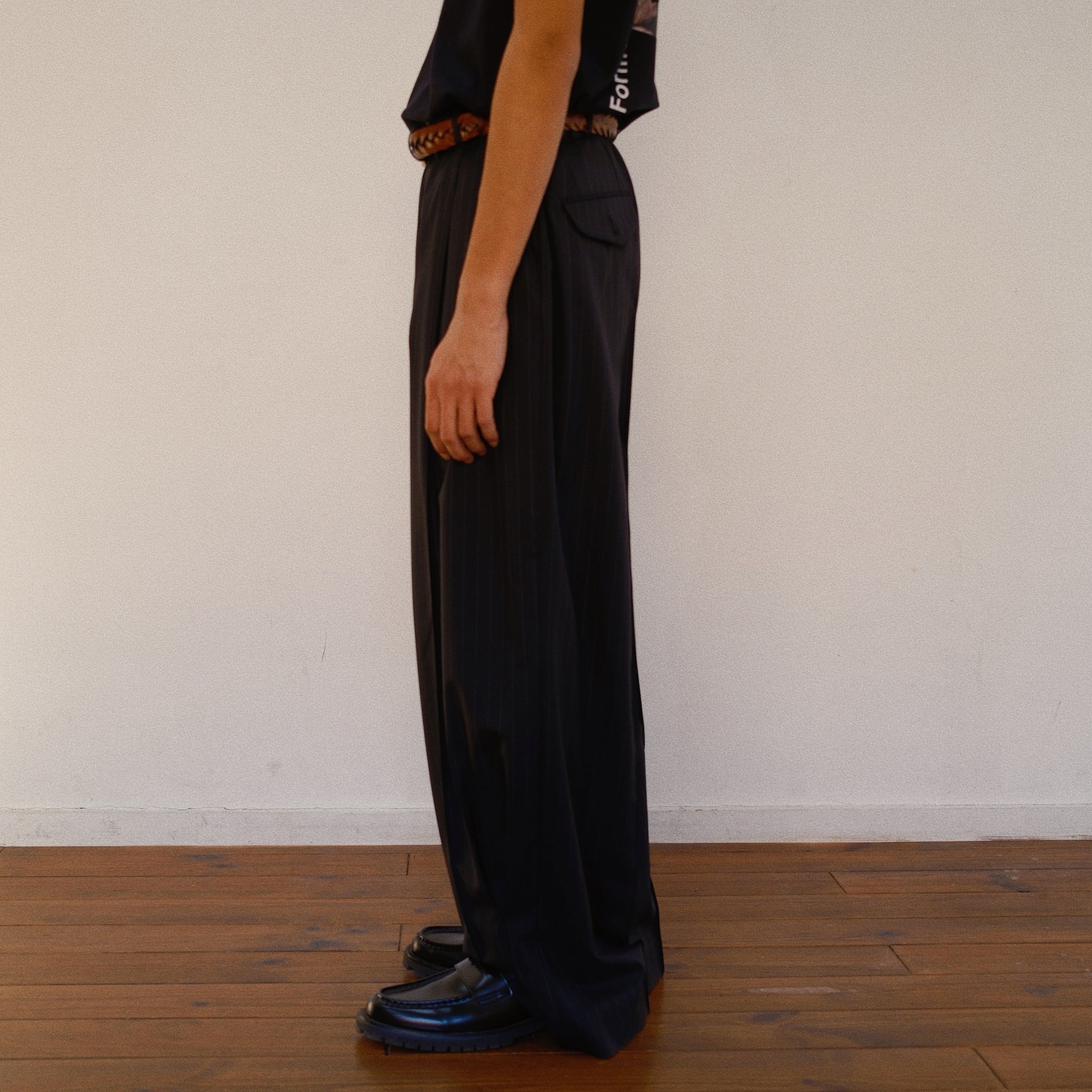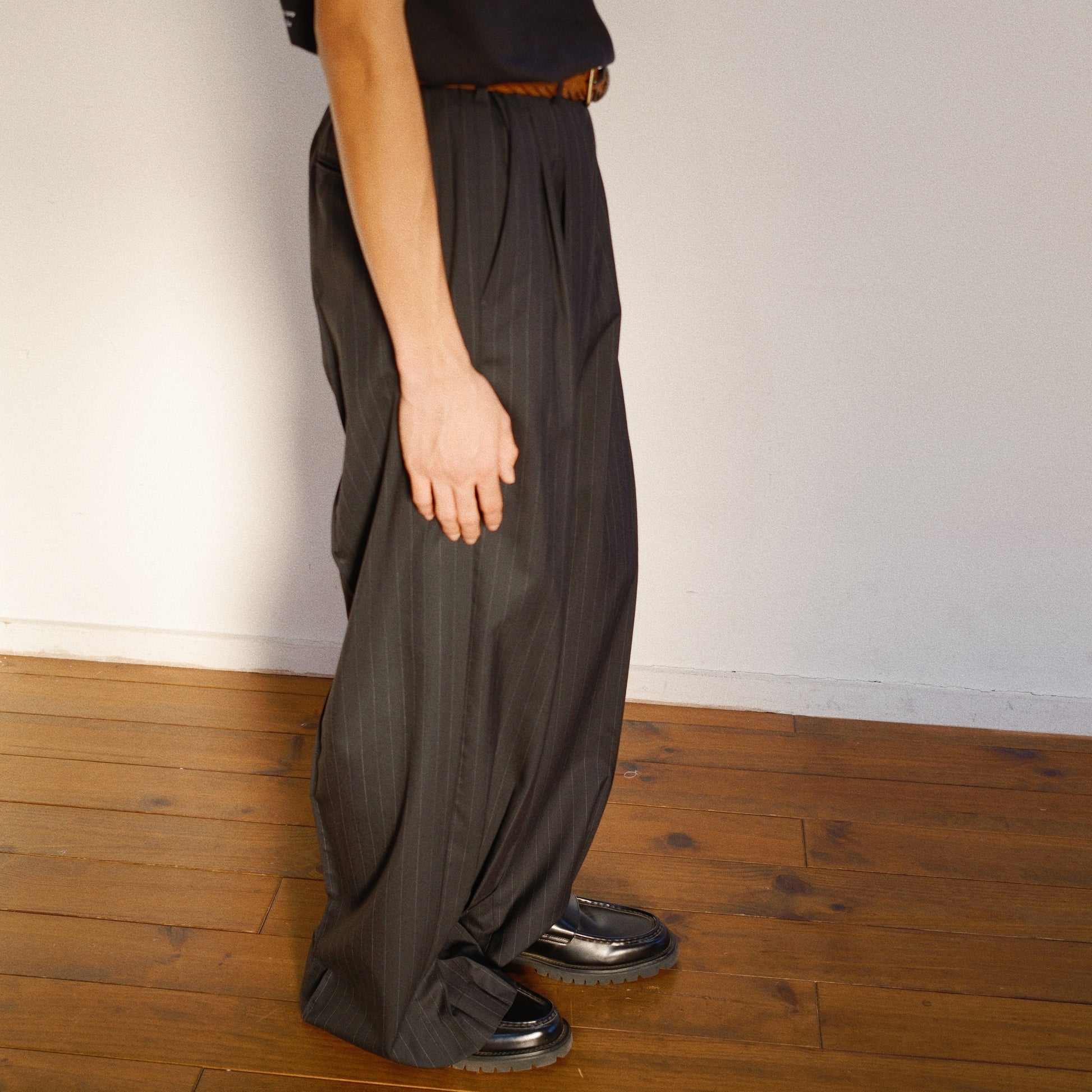 裾で抓まれたタックによりフレアのような立体感とドレープが美しいKHOKI定番のスラックスをストライプ柄のサマーウールで表現しました。