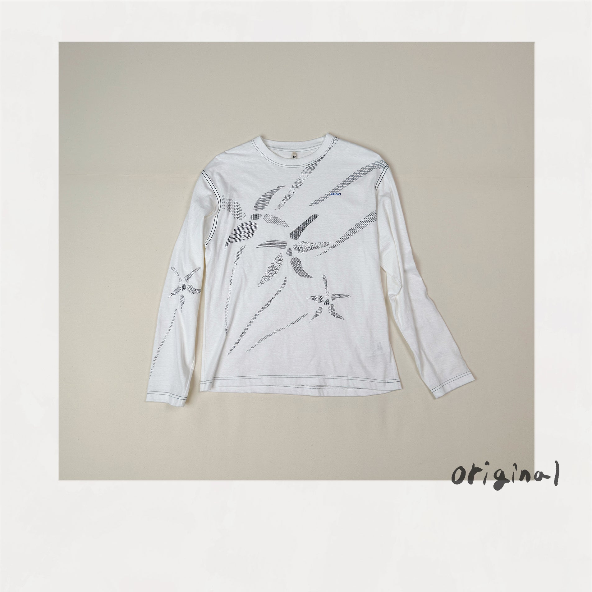 ASCIIアートという文字や記号のみで描く技術と、クロスステッチ刺繍の図案を組み合わせたグラフィック長袖Tシャツ。
