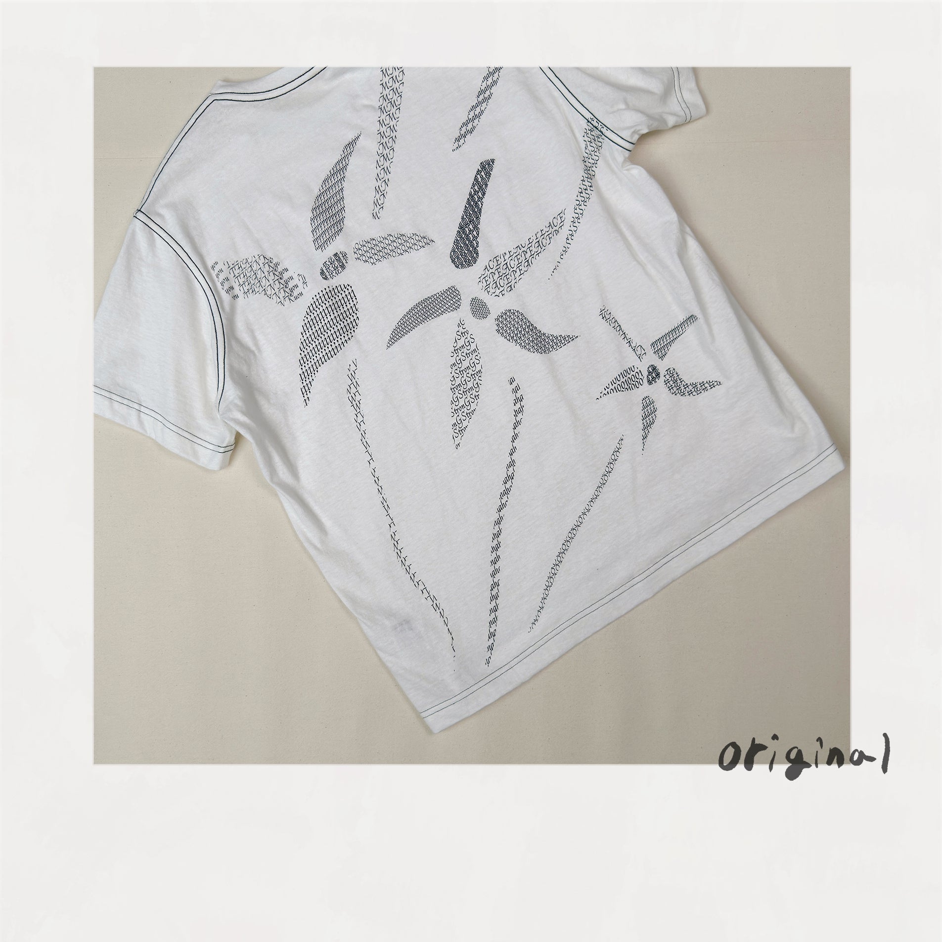 ASCIIアートという文字や記号のみで描く技術と、クロスステッチ刺繍の図案を組み合わせたグラフィック半袖Tシャツ。