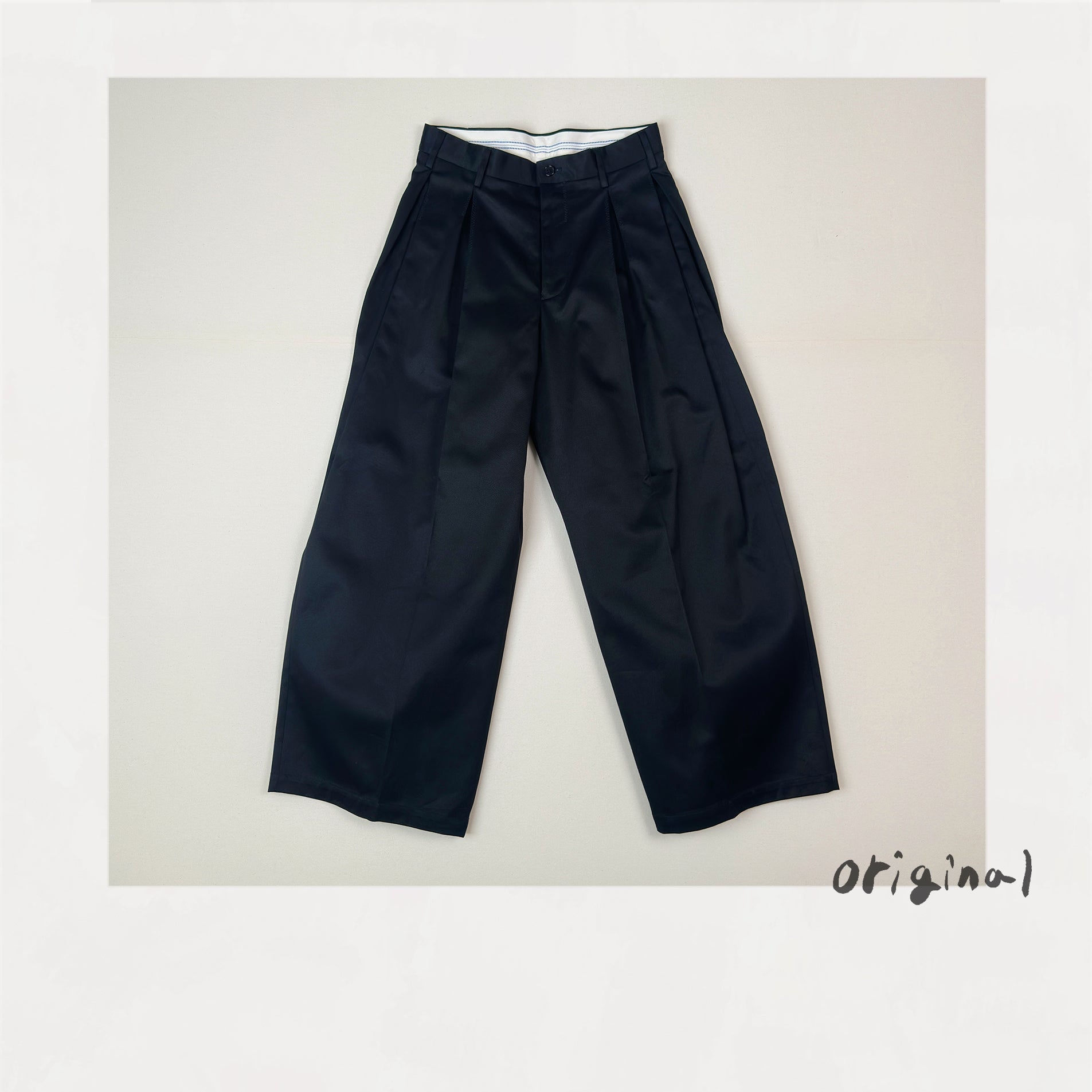 高密度に織られ、ドレッシーな光沢が特徴のチノ素材を採用し、スラックスベースのタックパンツへと落とし込みました。ドレスでもカジュアルでも組み合わせられる秀才な1着です。