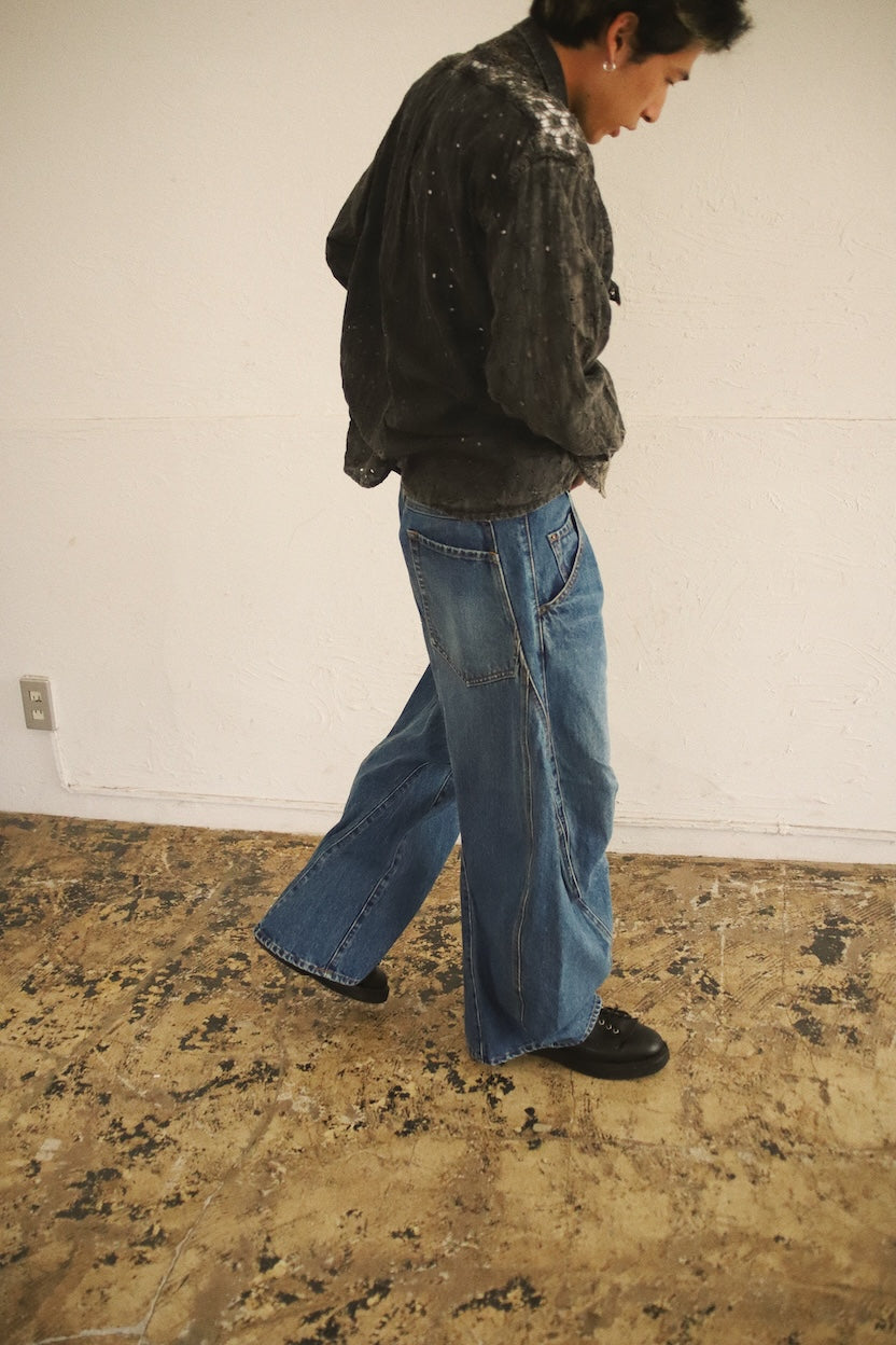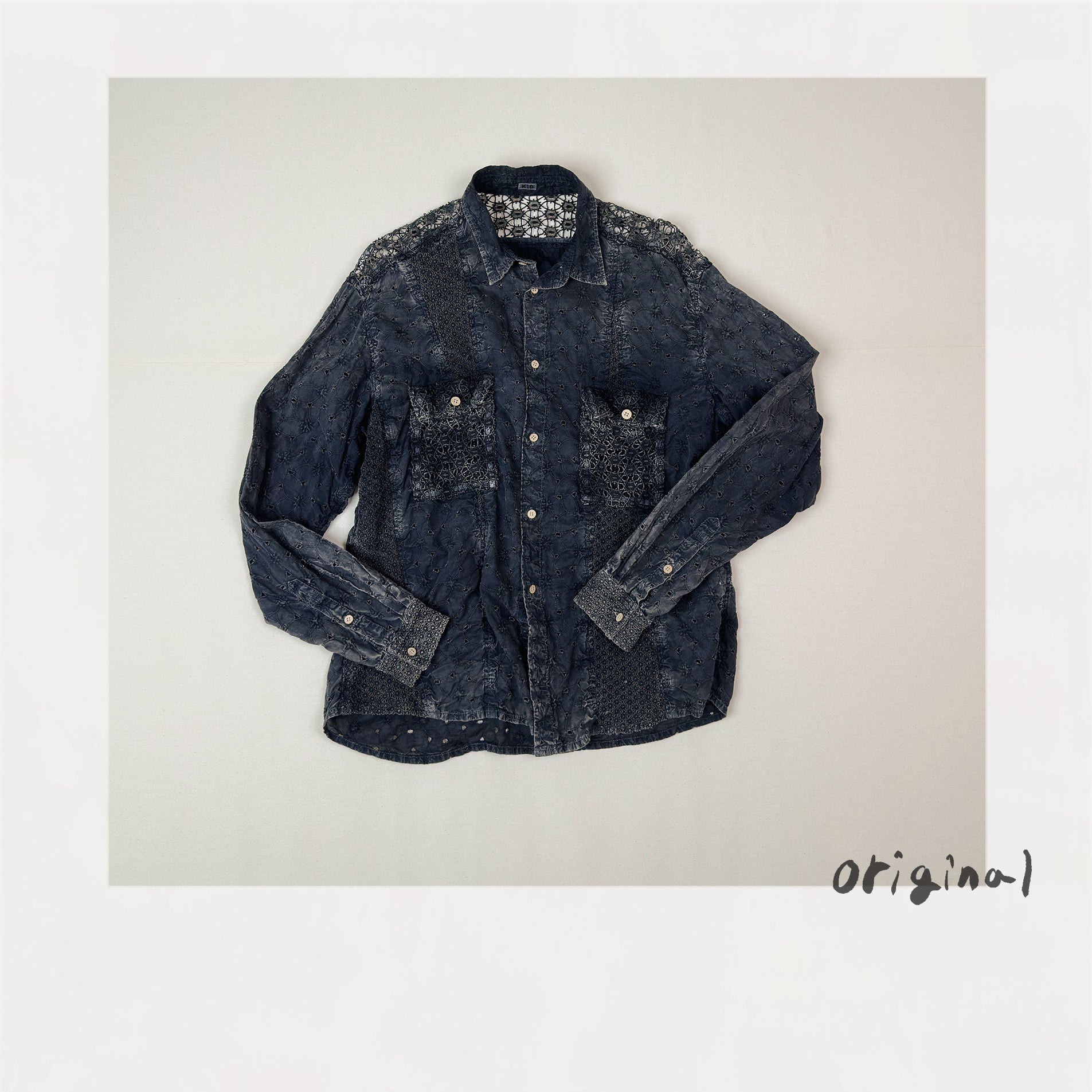 今季のキーワードのひとつである、メンズ服の文脈におけるレースの活用を投影した、レースのパッチワークシャツ。