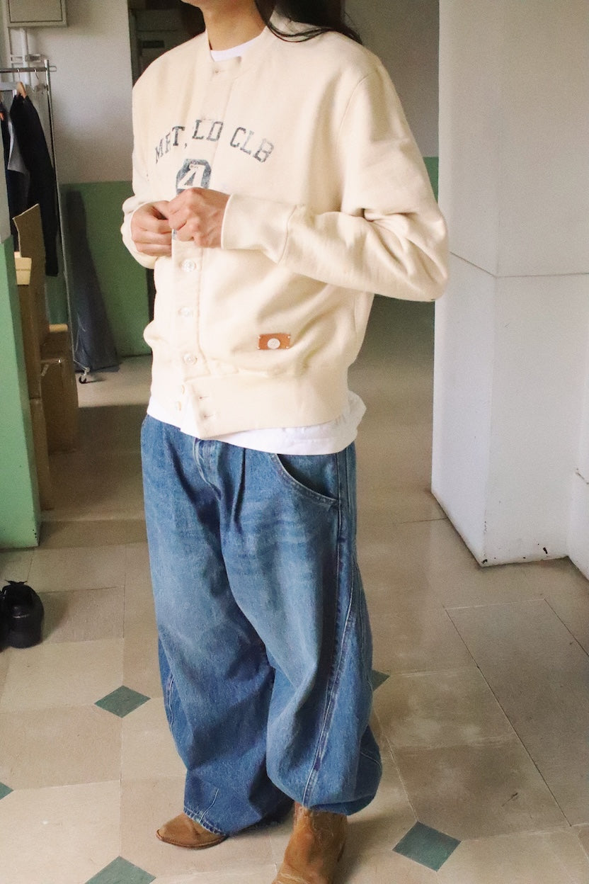 カレッジロゴシリーズのKHOKI定番、丸首スウェットカーディガン。